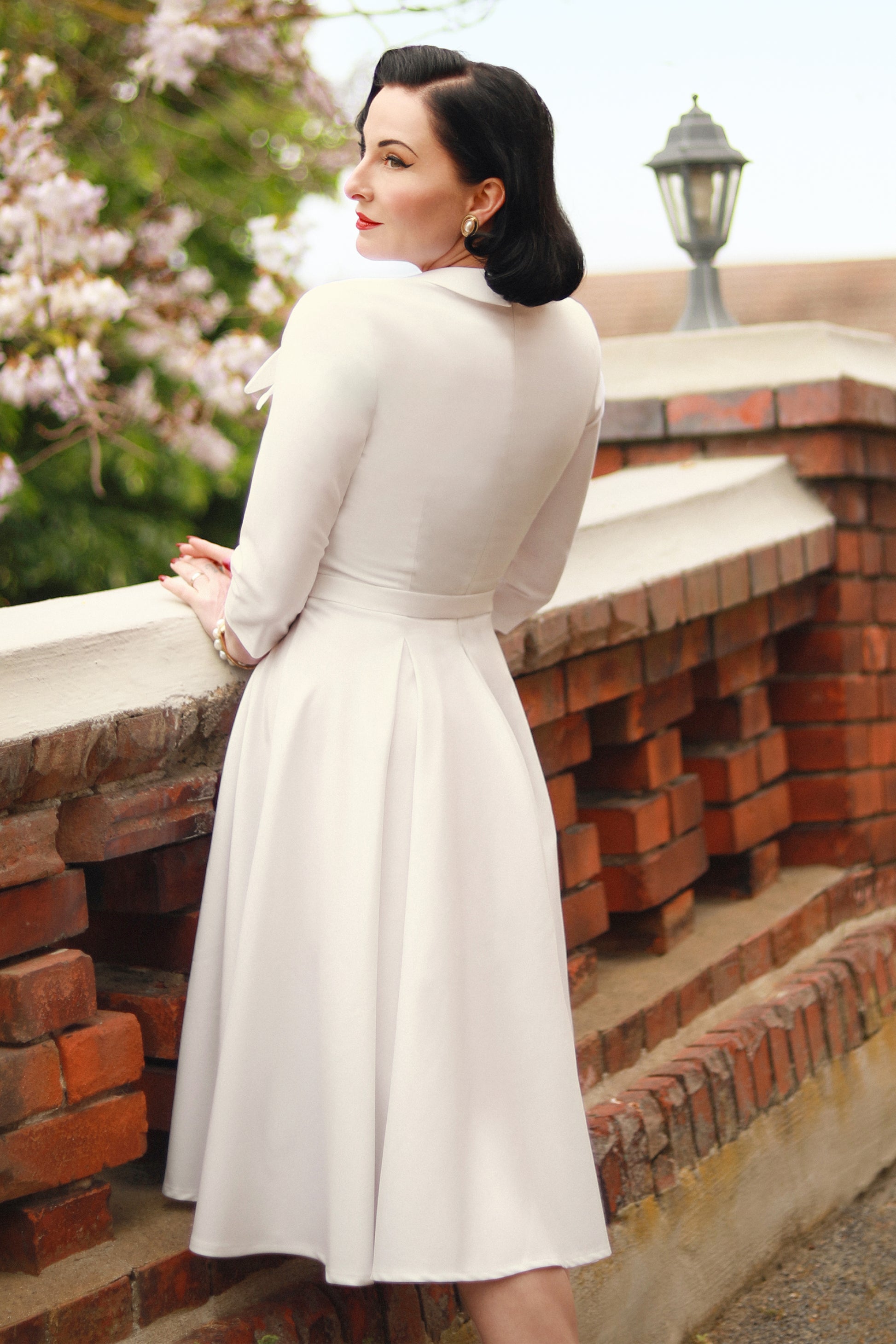 A girl can't help it... just one look at The Jayne Swing Dress and she'll say 'YES'! ;-) This season our talented in-house designers have once again created an irresistible collection for our very own Vintage Diva brand! This flirty swing dress is inspired by the dress worn by Jayne Mansfield in the 1956 film The Girl Can't Help It. Made of a firm, yet supple, high quality fabric in off white that has a light stretch, is a joy to wear and sways beautifully with every step you take. ''Jayne... you will forever be my always!''