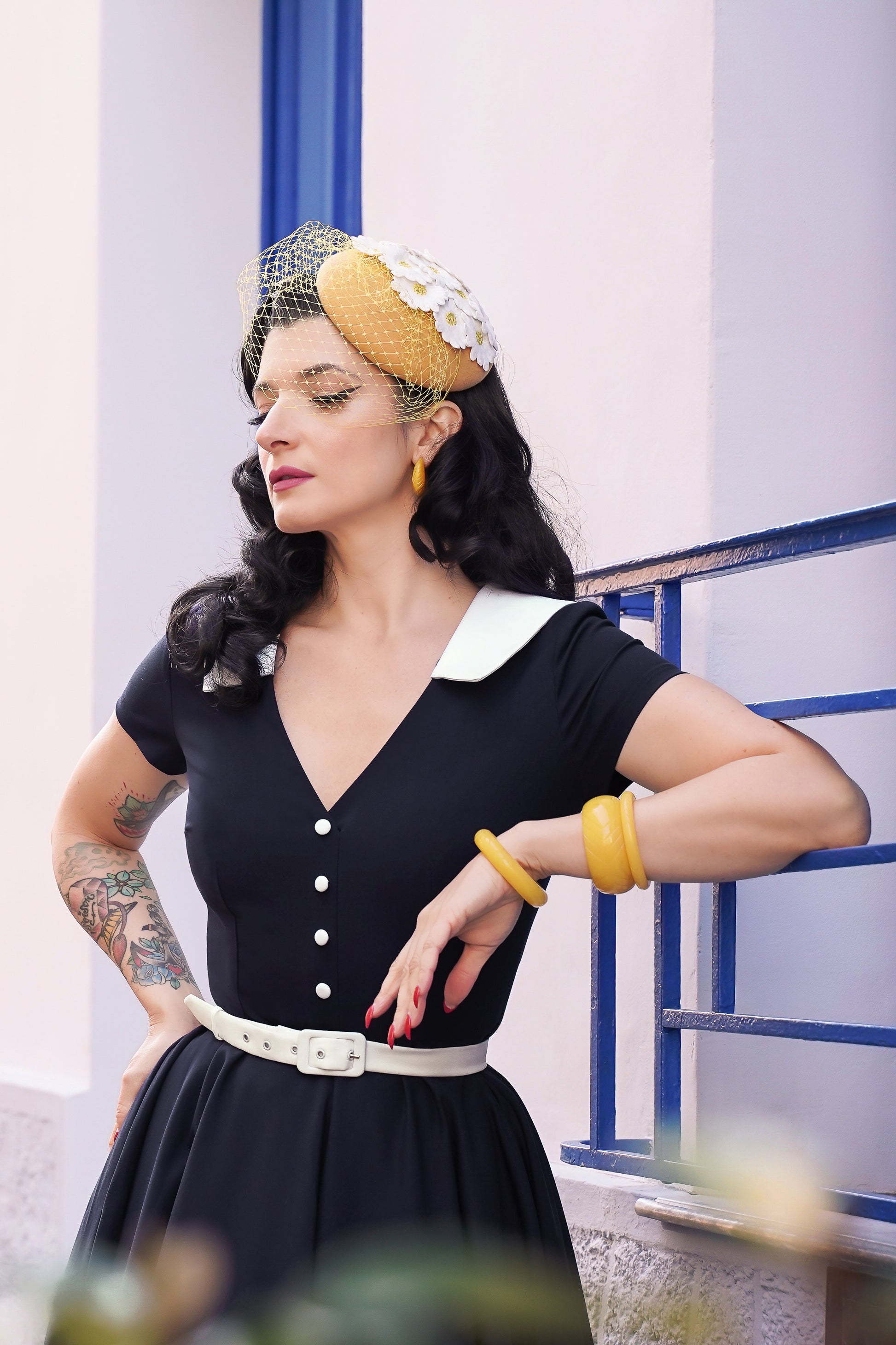You will feel like the star in your own romantic movie when you put on The Vallea Swing Dress in Navy! Feeling a little lightheaded from the delicious wine you just had with your tasty pasta dish, you, the one and only Diva, are strolling along the streets of Rome in this navy beauty. Not on your own of course but with your everyday crush... La Dolce Vita ;-). Just like our previous Vintage Diva stunners, The Vallea was also designed by our own in-house designers. The fitted top flaunts a contrasting white collar, a row of faux buttons, short sleeves and bra strap holders to keep your bra straps from poking out. From the white belt at the waist she runs into a flowy full swing skirt; gorgeous fifties silhouette, guaranteed! The sturdy, yet supple, high quality fabric in navy blue has a light stretch, is a joy to wear and gracefully moves along with every step you take. Are you ready to set off on your romantic adventure? Ready, set... order!